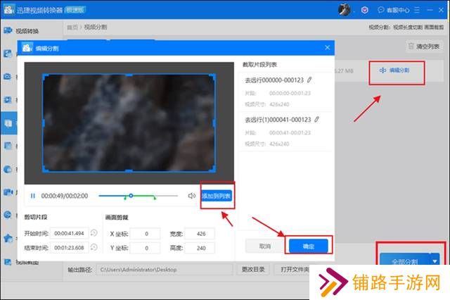 第二步 上传好视频文件之后,点击【编辑分割】按钮,在弹出的页面中进行分段。选择好需要分段的位置后,点击【添加到列表】,可以重复操作。操作完成之后,点击右下角的【确定】按钮。就会返回到上一页面,点击【全部分割】即可。
