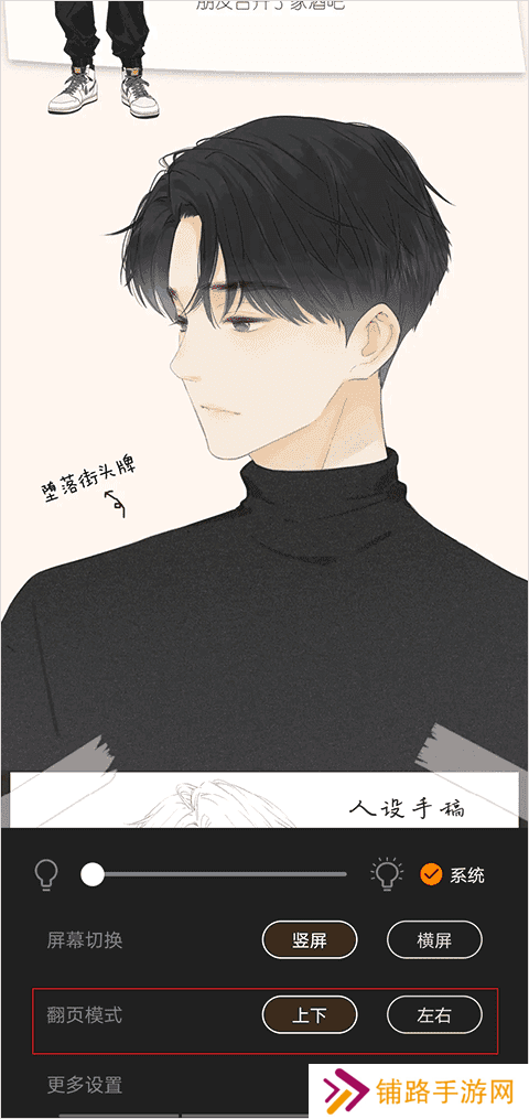 2、同样是在漫画界面点击界面会显示设置,在设置中可以切换翻页方式,选择你习惯的方式即可。