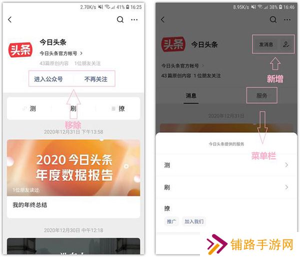 三、公众号改版本次更新,公众号界面也有所改变,移除了“进入公众号”和“不再关注”按钮;右侧添加了“发消息”和“取消关注”按钮;菜单栏被添加到【服务】栏目。