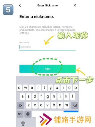5、输入昵称,未重复的昵称可继续下一步 Next
