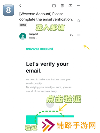 8、打开自己的邮箱会收到来自APP的验证邮件,点击Verify Email即可验证成功,这时候weverse账号注册就完成了,返回app就可以登陆啦