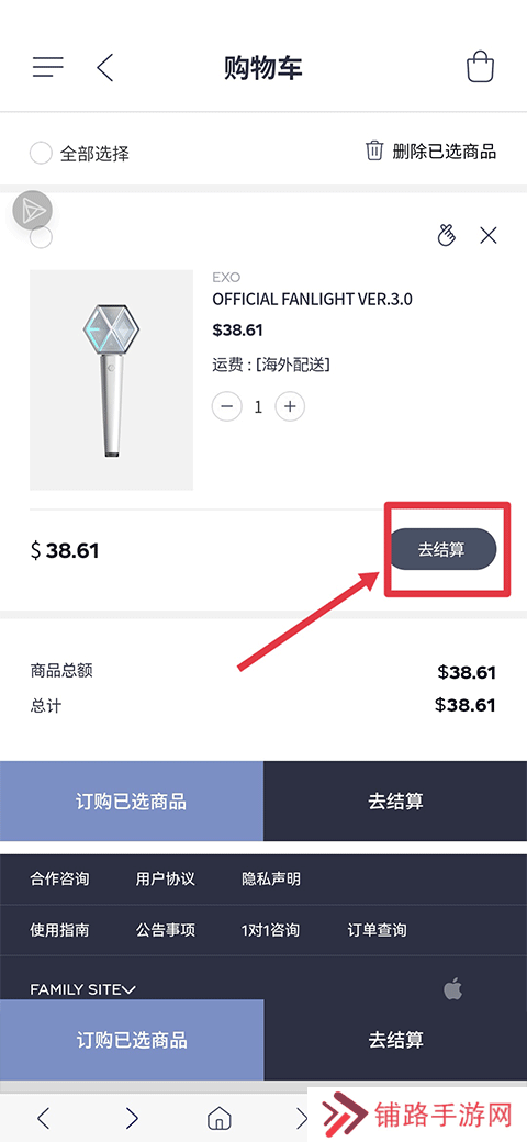 4、进入购物车后,勾选商品并点击去结算