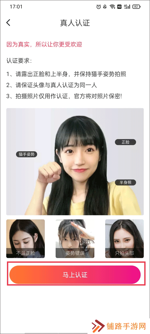 2、了解上方的认证要求,根据要求做出相对应的动作完成认证,点击马上认证。