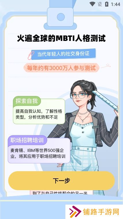软件介绍MBTI是全球流行的的性格测试工具,它在全球已经火了80多年,每年约有200万人参与测试。在职场上,不乏世界500强企业,将性格测试用于企业招聘培训;在社交中,MBTI成为当代年轻人新晋社交名片......每个人,都能从MBTI性格测试中洞悉自己的性格特质,发掘自己的另一面