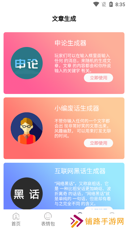 表情文案狗app是一款专门为用户打造的高品质文案交流软件,通过软件用户可以获取到更加丰富的表情包内容,您可以随时随地进行储存,功能也是很丰富的,同时也是提供了文章生成功能,有兴趣的用户现在就来下载吧!