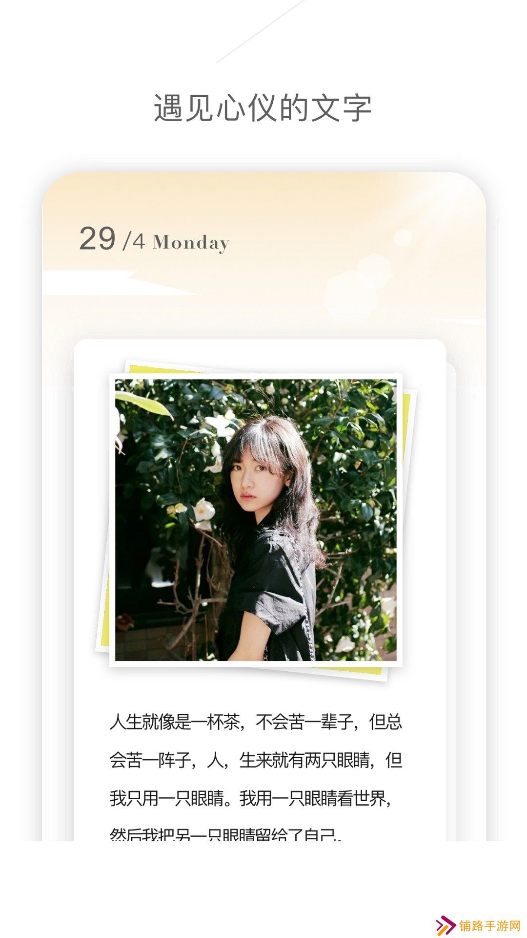 《流光》是一个心灵鸡汤阅读平台,为您准备了许多的美文,用户可以在线轻松的阅读;您在阅读美文的时候,还能轻松的发现更多的美图,这样就能让您轻松的找到自己需要的内容。用户可以在流光app里制作属于自己的日签,这里有超多的优美文字和唯美图片,用户遇到自己喜欢的可以把他们保存下来。