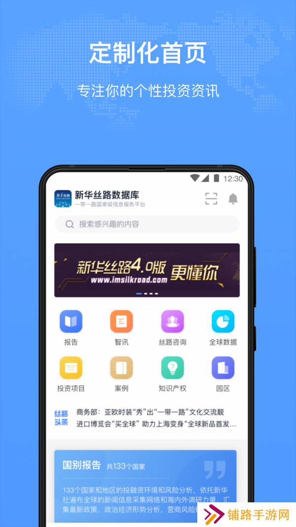 新华丝路APP一款专注于投资资讯的平台,这里提供各种全球数据、投资项目、案例、知识产权、园区、报告等资讯服务。每天都为用户更新最新、最热的投资资讯,资讯内容丰富,用户通过读这些投资资讯的阅读,能够全面帮助用户学习更多的投资知识,也可以掌握当前最新的投资资讯动态,提升自己的投资知识量,轻松完成投资,实现自己的财富管理。还有大量投资项目,了解更多的投资项目、案例,在线学习投资,让您的整个投资操作得到提高,做好投资,收益高。