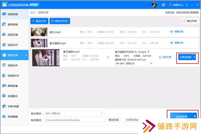 选择好需要分割的部分之后,我们可以看到在原视频的下方会显示出一个新的片段,点击视频右侧的“分割”或者下方的“全部转换”就完成了。