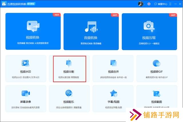 首先打开电脑上的“迅捷视频转换器”,看到软件·的第二行第二列的“视频分割”选项,点击选择。